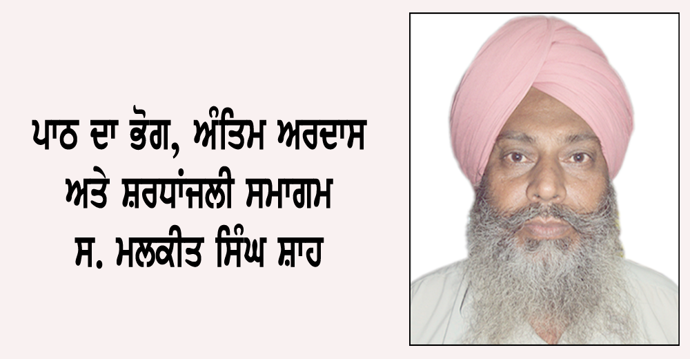 ਆਪ ਜੀ ਨੂੰ ਬਹੁਤ ਹੀ ਗਹਿਰੇ ਦੁੱਖ ਨਾਲ ਸੂਚਿਤ ਕਰ ਰਹੇ ਹਾਂ ਕਿ ਸਰਦਾਰ ਮਲਕੀਤ ਸਿੰਘ ਜੀ ਸ਼ਾਹ (66) ਪੁੱਤਰ ਸਵ. ਗੰਗਾ ਸਿੰਘ ਸ਼ਾਹ ਸਾਬਕਾ ਸਰਪੰਚ ਵਾਸੀ ਪਿੰਡ ਠੱਟਾ ਨਵਾਂ ਜੋ ਬੀਤੇ ਦਿਨੀਂ ਮਿਤੀ 19.05.2025 ਨੂੰ ਸਵੇਰੇ 11:15 ਵਜੇ ਸੰਖੇਪ ਜਿਹੀ ਬੀਮਾਰੀ ਪਿਛੋਂ ਅਕਾਲ ਚਲਾਣਾ ਕਰ ਗਏ ਸਨ। ਉਹਨਾਂ ਨਮਿੱਤ ਰੱਖੇ ਗਏ ਸ੍ਰੀ ਅਖੰਡ ਪਾਠ ਸਾਹਿਬ ਦਾ ਭੋਗ ਮਿਤੀ 27.05.2025 ਦਿਨ ਮੰਗਲਵਾਰ ਨੂੰ ਸਵੇਰੇ 11 ਵਜੇ ਉਹਨਾਂ ਦੇ ਗ੍ਰਹਿ ਪਿੰਡ ਠੱਟਾ ਨਵਾਂ ਵਿਖੇ ਪਵੇਗਾ। ਉਪਰੰਤ ਅੰਤਿਮ ਅਰਦਾਸ ਅਤੇ ਸ਼ਰਧਾਂਜਲੀ ਸਮਾਗਮ ਗੁਰਦੁਆਰਾ ਸਾਹਿਬ ਪਿੰਡ ਠੱਟਾ ਨਵਾਂ ਵਿਖੇ ਦੁਪਹਿਰ 12 ਵਜੇ ਤੋਂ 1 ਵਜੇ ਤੱਕ ਹੋਵੇਗਾ।