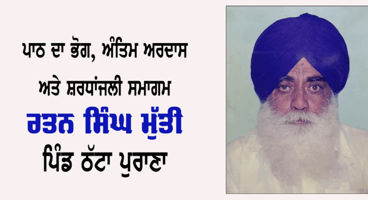 ਆਪ ਜੀ ਨੂੰ ਬੜੇ ਹੀ ਦੁਖੀ ਹਿਰਦੇ ਨਾਲ ਸੂਚਿਤ ਕੀਤਾ ਜਾਂਦਾ ਹੈ ਕਿ ਰਤਨ ਸਿੰਘ ਮੁੱਤੀ (80) ਠੱਟਾ ਪੁਰਾਣਾ ਜਿਨਾਂ ਦਾ ਬੀਤੇ ਦਿਨੀਂ ਸੰਖੇਪ ਬਿਮਾਰੀ ਉਪਰੰਤ ਦਿਹਾਂਤ ਹੋ ਗਿਆ ਸੀ। ਅੱਜ ਉਹਨਾਂ ਦਾ ਅੰਤਿਮ ਸੰਸਕਾਰ ਸ਼ਮਸ਼ਾਨ ਘਾਟ ਪਿੰਡ ਠੱਟਾ ਪੁਰਾਣਾ ਵਿਖੇ ਪਰਿਵਾਰਕ ਮੈਂਬਰਾਂ, ਰਿਸ਼ਤੇਦਾਰਾਂ ਅਤੇ ਪਿੰਡ ਵਾਸੀਆਂ ਦੀ ਹਾਜ਼ਰੀ ਵਿੱਚ ਕਰ ਦਿੱਤਾ ਗਿਆ। ਸਵ. ਰਤਨ ਸਿੰਘ ਦੇ ਬੇਟੇ ਕੈਪਟਨ ਜਸਵਿੰਦਰ ਸਿੰਘ, ਸੁਖਵਿੰਦਰ ਸਿੰਘ ਸਾਹਬਾ, ਅਮਰਜੀਤ ਸਿੰਘ ਯੂਕੇ ਵੱਲੋਂ ਚਿਤਾ ਨੂੰ ਅਗਨੀ ਵਿਖਾਈ ਗਈ। ਵੱਡੀ ਗਿਣਤੀ ਵਿੱਚ ਰਿਸ਼ਤੇਦਾਰ, ਸਾਕ ਸਬੰਧੀਆਂ ਵੱਲੋਂ ਪਰਿਵਾਰ ਨਾਲ ਦੁੱਖ ਸਾਂਝਾ ਕਰਦਿਆਂ ਹਮਦਰਦੀ ਪ੍ਰਗਟ ਕੀਤੀ। ਇਸ ਮੌਕੇ ਜਾਣਕਾਰੀ ਦਿੰਦੇ ਹੋਏ ਸਵ ਰਤਨ ਸਿੰਘ ਮੁੱਤੀ ਦੇ ਭਰਾਤਾ ਸਾਬਕਾ ਡੀ.ਐਸ.ਪੀ. ਬਚਨ ਸਿੰਘ ਮੁੱਤੀ ਨੇ ਦੱਸਿਆ ਕਿ ਉਨ੍ਹਾਂ ਨਮਿੱਤ 7 ਜੁਲਾਈ ਦਿਨ ਸੋਮਵਾਰ ਨੂੰ ਉਨਾਂ ਦੇ ਗ੍ਰਹਿ ਨਿਵਾਸ ਵਿਖੇ ਸ੍ਰੀ ਅਖੰਡ ਪਾਠ ਸਾਹਿਬ ਜੀ ਦੇ ਭੋਗ 10:30 ਵਜੇ ਪਾਏ ਜਾਣਗੇ। ਉਪਰੰਤ ਗੁਰਦੁਆਰਾ ਦਮਦਮਾ ਸਾਹਿਬ ਠੱਟਾ ਵਿਖੇ 11:30 ਵਜੇ ਤੋਂ 12:30 ਵਜੇ ਤੱਕ ਅੰਤਿਮ ਅਰਦਾਸ ਅਤੇ ਕੀਰਤਨ ਸਮਾਗਮ ਹੋਵੇਗਾ।